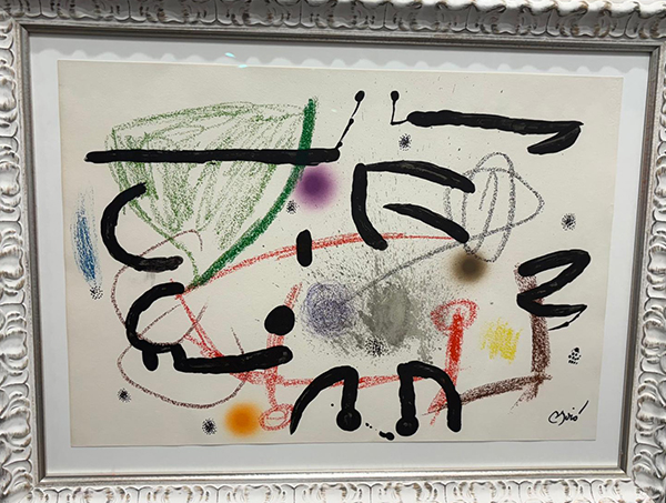 Descripción breve: Obra gráfica en la que Miró despliega su característico lenguaje plástico: trazos negros enérgicos combinados con manchas de color vibrantes y formas orgánicas. La composición transmite un dinamismo lúdico y poético, propio de su búsqueda de un universo simbólico entre lo infantil, lo onírico y lo cósmico.